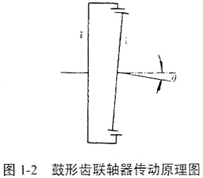 鼓形齒聯(lián)軸器傳動原理如圖1-2所示。鼓形齒聯(lián)軸器的內(nèi)齒輪為一直齒內(nèi)齒輪,外齒輪是齒頂面為一球面的鼓形齒輪。根據(jù)外齒輪齒面形成方式的不同,外齒輪又分為共軛齒面鼓形齒輪和非共軛齒面鼓形齒輪。由于鼓形齒輪加工工藝的關(guān)系,現(xiàn)使用的鼓形齒聯(lián)軸器多為非共軛齒面外齒輪的鼓形齒聯(lián)軸器。共軛齒面的鼓形齒齒面由與內(nèi)齒輪共軛的加工方式產(chǎn)生;非共軛齒面的鼓形齒齒面相當于在不同端截面逐漸變位的一系列齒輪片機疊而成,變位量與軸向坐標形成的曲線稱為鼓度曲線。鼓度曲線是鼓形齒聯(lián)軸器特有的重要幾何參數(shù),現(xiàn)所用的多為一段圓弧,也有用三段圓弧的,這些圓稱為位移圓。在圓弧鼓度曲線中,有位移中心在齒輪軸線上的,有不在軸線上的;有位移圓中心與齒頂球面中心重合的,也有不同中心的,鼓度曲線的設(shè)計無統(tǒng)一理論方法,通常是以經(jīng)驗設(shè)計。究竟采用哪種曲線,有不同的考慮方面,總的選定要求是:(1)在軸間傾角處于最大時不出現(xiàn)棱邊接觸現(xiàn)象;(2)輪齒集中載荷越小越好,而齒面曲率與位移圓曲率成正比,因此位移圓半徑應(yīng)盡可能大。鼓度曲線曲率半徑與內(nèi)齒單側(cè)減薄量成正比關(guān)系,即它與齒的嚙合間隙有關(guān),減薄量不足可能會造成干涉,減薄量過大則會削弱齒的強度且側(cè)隙太大。