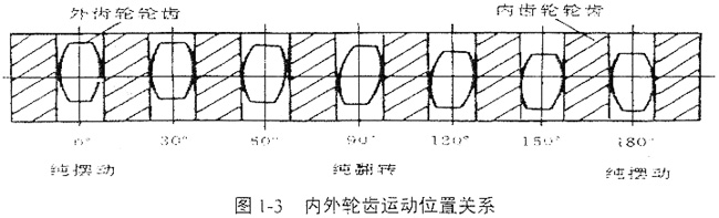 鼓形齒聯(lián)軸器的運動是復雜的空間運動,現(xiàn)有資料均把它簡化為展開的平面運動來進行分析,在有軸間傾角的狀態(tài)下,將運動分為齒的擺動運動和翻轉(zhuǎn)運動。這兩種運動在嚙合過程的半周中經(jīng)歷純擺動—復合運動—純翻轉(zhuǎn)—復合運動—純擺動的循環(huán)運動過程,如圖1-3所示。純擺—純翻轉(zhuǎn)的相位差為90°。在非純擺動和純翻轉(zhuǎn)運動過程中,內(nèi)外齒的相對運動是擺動運動和翻轉(zhuǎn)運動的復合運動。顯然這種簡化分析方法是很粗略的,無法確切地描述它們的空間嚙合狀態(tài),但是它對于分析齒向位移、棱邊卡死現(xiàn)象及說明某一輪齒所處周向位置是有意義的。