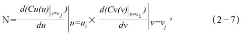 降維插直法就是從已知的數(shù)字化離散曲面出發(fā),將數(shù)字曲面分別沿下同的方向u,v構(gòu)造一個整體上具有二階連續(xù)導數(shù)的三次樣條插直曲線。兩條交叉的插直內(nèi)線在交叉點的切向量的向量積,就是數(shù)字化曲面在這一點的法向量N,如圖2-25所示。根據(jù)三次樣條插值的唯一性,由曲線插值所求得的法向量是相等的。然后按照曲面相對運動過程的共軛條件,建立求解極小值數(shù)學規(guī)劃模型,應(yīng)用優(yōu)化算法,即可求得與已知數(shù)字曲面Σ1、相共軛的數(shù)字化曲面Σ2。
