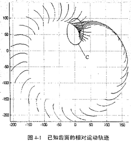 在已知齒輪齒面一個(gè)周期的相對運(yùn)動所留下的運(yùn)動軌跡中,我們可以看出,在區(qū)域C中出現(xiàn)了一個(gè)清晰的包絡(luò)面,它就是所求的未知齒面,即兩齒面在C區(qū)嚙合,稱C區(qū)為嚙合區(qū),而在C區(qū)之外,也會出現(xiàn)包絡(luò),但那只是幾何意義上的共軛點(diǎn),不產(chǎn)生真正意義上的嚙合傳動;已知齒面在嚙合區(qū)域與非嚙合區(qū)域有較清晰的界限;在嚙合區(qū)域,已知曲面與所求齒面的共軛關(guān)系是簡單的,無論是否會出現(xiàn)二次接觸,這一區(qū)域的共軛曲面都可以用數(shù)字化共軛曲面求解方法求出。
