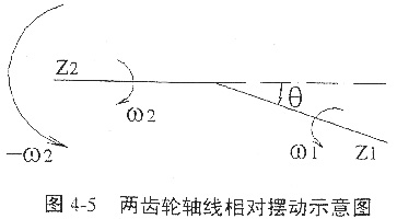 設(shè)兩齒輪的軸線分別為z1,z2,與之固連的坐標(biāo)系分別為S1,S2,轉(zhuǎn)動角速度分別為ω1,ω2,兩軸線交角為θ,F(xiàn)暫不考慮兩齒輪的嚙合運(yùn)動,只考察兩齒輪的相對擺動,為使z2固定不動,可假設(shè)給系統(tǒng)添加一個(gè)繞z2軸且與ω2大小相同、方向相反的運(yùn)動,如圖4-5所示。則與齒輪固連的坐標(biāo)系S1相對于S2的運(yùn)動可以描述為繞z1軸的自轉(zhuǎn)與繞z2軸的公轉(zhuǎn)。