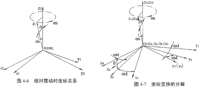 把以上的相對擺動具體化,考慮兩坐標(biāo)系的變換,在靜坐標(biāo)系S2中觀察,整個(gè)S1坐標(biāo)系只有2個(gè)自由度,即S1分別繞z1軸的自轉(zhuǎn)和繞z2軸的公轉(zhuǎn)。在交角不變的情況下兩坐標(biāo)系的關(guān)系可用圖4-6表示。