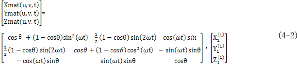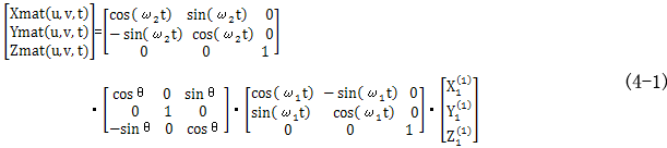 這種相對擺動的結(jié)果形成一個(gè)直齒面的包絡(luò)面,在直齒面擺動的任何位置,兩者都共軛線接觸。利用兩坐標(biāo)系的幾何關(guān)系和空間坐標(biāo)變換,直齒面在靜坐標(biāo)系中形成的曲面族可用下式表示為