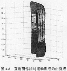 以上述計(jì)算出的擺動包絡(luò)面為已知齒面,按照兩齒輪的運(yùn)動關(guān)系,用前述介紹的方法,求出擺動包絡(luò)面的嚙合面,這個(gè)嚙合面既滿足已知直齒面在一定角度范圍內(nèi)擺動,又滿足兩齒面嚙合傳動,它是一個(gè)鼓形齒面。在兩齒面?zhèn)鲃雍鸵阎饼X輪擺動的任何一個(gè)位置,鼓形齒面和已知直齒面都共軛接觸。