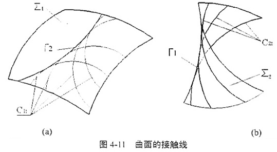 無論是已知曲面上的C1t還是共軛曲面上的C2t,當(dāng)t取不同的值時(shí),就得到不同位置的曲線,也就是說,{C1t}、{C2t}是以t為參數(shù)的曲線族,那么在曲面Σ1或Σ2上就可能存在曲線族{C1t}、{C2t}的包絡(luò)線。在已知曲面Σ1上,如果曲面族{C1t}存在包絡(luò),那么以包絡(luò)線為界可以把Σ1分成兩部分(如圖4-11a所示),一部分布滿了接觸線C1t,一部分則沒有,這條包絡(luò)線Γ2稱為二界包絡(luò)曲線,其上的各點(diǎn)稱為二類界限點(diǎn),也稱為嚙合界限點(diǎn);對于共軛曲面Σ2,因?yàn)棣?sub>2全部是由{C2t}組成的,所以如果曲線族{C2t}的包絡(luò)存在,則此包絡(luò)也就是曲面Σ2的脊線(如圖4-11b所示),這條包絡(luò)線Γ1稱為一界包絡(luò)曲線,其上的各點(diǎn)稱為一類界限點(diǎn),也稱為根切界限點(diǎn)或曲率干涉界限點(diǎn)。嚙合界限點(diǎn)可用于判斷已知曲面上有效的嚙合區(qū)域,根切界限點(diǎn)可用于避免共軛曲面的根切,這兩類界限點(diǎn)對于共軛曲面的求解有著重要的意義,同時(shí)也是評價(jià)共軛運(yùn)動質(zhì)量的重要指標(biāo)之一。