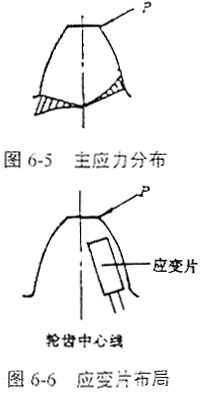 鼓形齒聯(lián)軸器內(nèi)外齒輪的嚙合齒對(duì)承受所作用的轉(zhuǎn)矩的作用,一般情況下,內(nèi)齒輪輪齒的剛度大于外齒輪輪齒的剛度,為了能更有效地反映應(yīng)變,工作應(yīng)變片貼于外齒輪輪齒的端面,溫度補(bǔ)償應(yīng)變片貼于不受力的相同材料上。輪齒的應(yīng)力狀態(tài)較復(fù)雜,在齒根處還存在應(yīng)力集中的情況下,但總的來說,對(duì)于一個(gè)齒,其齒根主應(yīng)力分布如圖6-5所示,因此考慮工作應(yīng)變片貼于輪齒中心線受拉應(yīng)力的一側(cè),靠近齒根邊緣處。這樣既不影響齒的嚙合,又能有效地反映接觸狀況,貼片布局如圖6-6所示。由于輪齒端面位置較為狹小,無(wú)法貼兩片應(yīng)變片,因此采用單臂工作方式測(cè)試。試件的選擇應(yīng)考慮加載量及貼片方便兩方面的因素,選擇模數(shù)較大的試件,便于貼片操作,但所需要加的載荷也較大,給操作帶來困難;反之則加載方便,但貼片較困難。綜合考慮上述兩方面的因素,并考慮能反映工業(yè)應(yīng)用的實(shí)際情況,本實(shí)驗(yàn)選用實(shí)際使用的鼓形齒聯(lián)軸器為試件,齒輪模數(shù)m=3mm,齒數(shù)z=56,其內(nèi)外齒加工精度分別為7級(jí)和6級(jí),材料均為ZG45鋼,熱處理為調(diào)質(zhì)處理,兩個(gè)鼓形齒輪分別為圓弧鼓度曲線和優(yōu)化鼓度曲線。