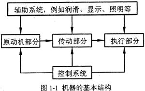 機(jī)器的發(fā)展經(jīng)歷了一個(gè)由簡(jiǎn)單到復(fù)雜的過(guò)程,人類為滿足生產(chǎn)及生活的需要,設(shè)計(jì)和制造出了種類繁多、功能各異的機(jī)器。機(jī)器類型多種多樣,基本結(jié)構(gòu)可以歸結(jié)為如圖1-l所示。機(jī)器的功能各異,所要求的運(yùn)動(dòng)形式千變?nèi)f化,并且需要克服的阻力、阻力矩也因機(jī)器工作情況而異。一般說(shuō)來(lái),原動(dòng)機(jī)的運(yùn)動(dòng)形式、運(yùn)動(dòng)及動(dòng)力參數(shù)都是有限的,而且是確定的。這樣必須解決把原動(dòng)機(jī)的運(yùn)動(dòng)形式、運(yùn)動(dòng)及動(dòng)力參數(shù)轉(zhuǎn)變?yōu)閳?zhí)行部分所需的運(yùn)動(dòng)形式、運(yùn)動(dòng)及動(dòng)力參數(shù)的問(wèn)題。這就必須靠機(jī)器的傳動(dòng)部分來(lái)完成,即機(jī)器中的傳動(dòng)部分是機(jī)器為完成各種功能所必需的基本構(gòu)成。