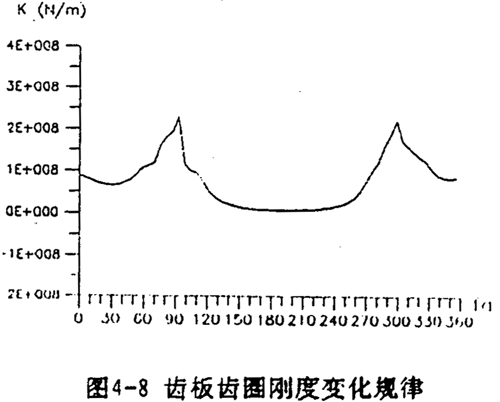 從圖中還可以看到,齒圈厚度較小的范圍(120°~240°)剛度值較小,在180°附近取得最小值,這與40型三環(huán)齒板相符。