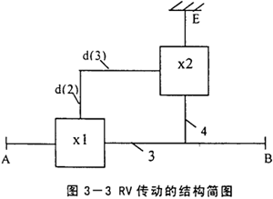 為計算RV傳動的傳動比,將上述的傳動簡圖用圖3-3所示的結(jié)構(gòu)簡圖代替。該機構(gòu)簡圖包括兩個簡單行星機構(gòu):x1和x2。輸出件A為中心輪1,輸出件B為輸出盤6,且有ω6=ω4。支承件E為針輪7,漸開線行星輪2與轉(zhuǎn)臂(曲柄軸)3均為輔助件d。