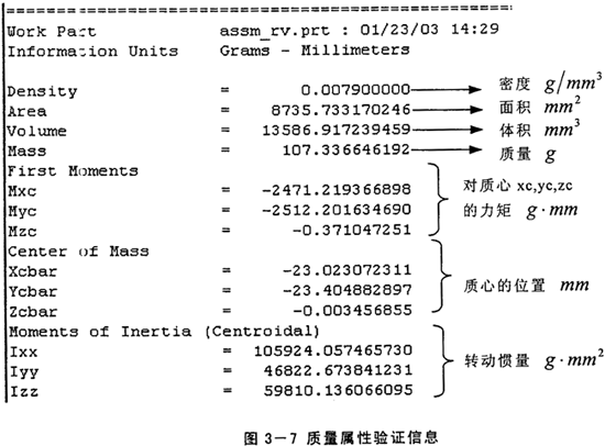 通過UG強大的質(zhì)量屬性檢驗功能,可獲得每個零件及整個模型的密度、體積、質(zhì)量和慣量等必要信息。上圖3-7是所獲得的擺線輪的相關(guān)信息。