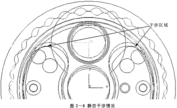 后三種都是實際結(jié)構(gòu)可能存在的,當(dāng)出現(xiàn)第一種干涉即硬干涉時就要引起高度重視,這可能是:設(shè)計存在問題,必須及時糾正。就是借助此功能,造型完成后,本人發(fā)現(xiàn)輸出盤與擺紅、輪間有硬干涉(見圖3-8),與設(shè)計此減速器的部門交換意見,原來他們在設(shè)計完后沒有發(fā)現(xiàn)此問題,等制造出成品后才發(fā)現(xiàn),便通過手工磨削將干涉部分除去。此處也充分體現(xiàn)了與傳統(tǒng)的設(shè)計方法相比,虛擬樣機技術(shù)有著不可比擬的優(yōu)越,即在制造第一臺物理樣機前就發(fā)現(xiàn)了機構(gòu)在結(jié)構(gòu)方面的缺陷。至于機構(gòu)的優(yōu)化和性能改進方面,通過后面的仿真分析更能清楚地展現(xiàn)虛擬樣機技術(shù)的優(yōu)越。