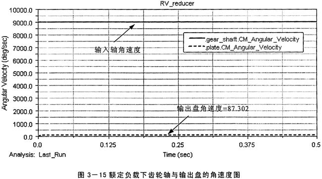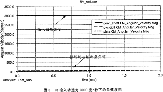 按RV減速器傳動比的理論計算公式i16=1+(z2/z1)Z7,由村課題所研究的RV減速器的參數(shù):Z2=34,Z1=10,Z7=30,計算得到總的傳動比為103,而由仿真得到的傳動比在圖3-8中為i=3000/29.12=103.02,在圖3-9中為i=600/5.829=102.93,且圖中擺線輪與輸出盤的角速度相等說明輸出部分施加的約束滿足等角速度輸出原理。