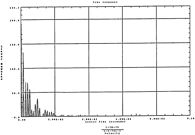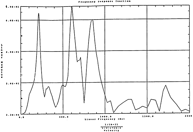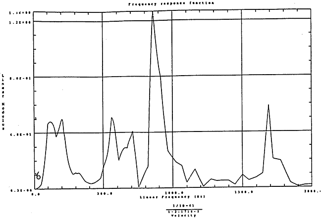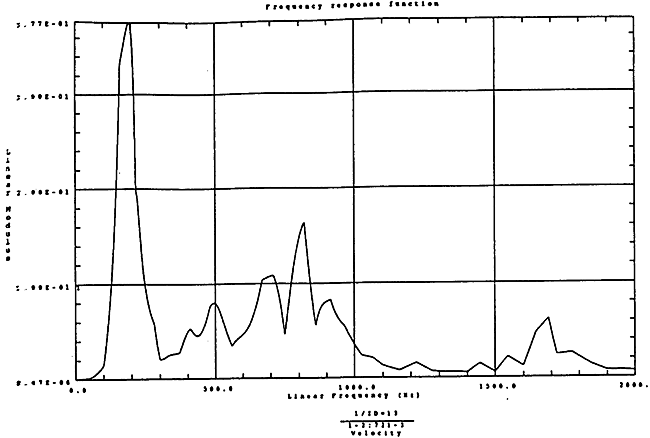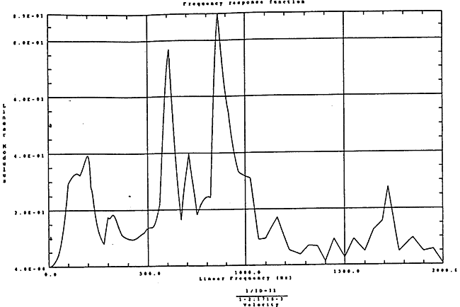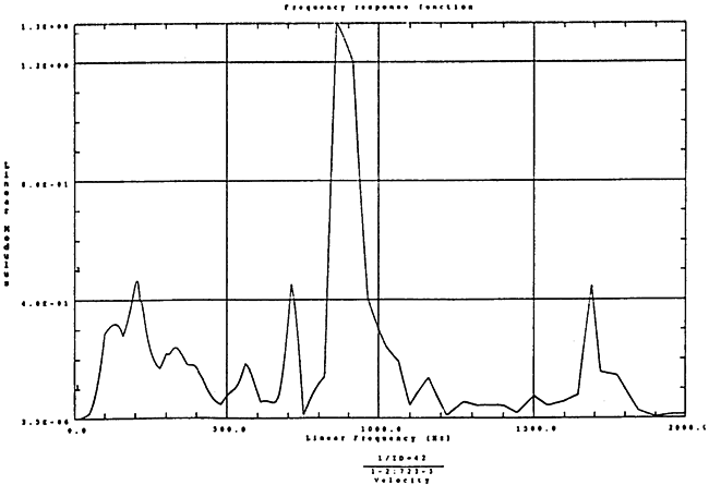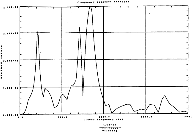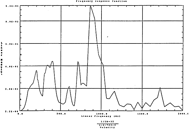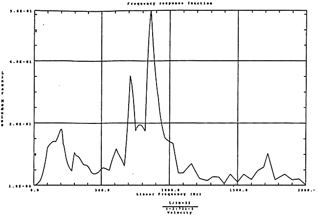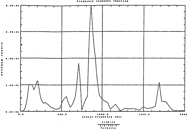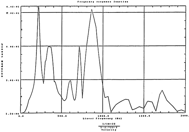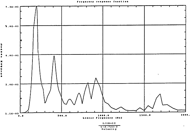 在如圖4-14的1000rm-400kgm工況下的載荷譜的激勵(lì)作用下,SHQ40振動(dòng)系統(tǒng)測(cè)點(diǎn)2、5、8Z向的振動(dòng)速度的幅值函數(shù)如圖5-19、圖5-20和圖5-21所錄,圖5-22、圖5-23和圖5-24為其相應(yīng)的時(shí)域皮形。振動(dòng)速度的預(yù)估值與試驗(yàn)的實(shí)測(cè)值(如表6-13)對(duì)比見表5-1所示的工況四。