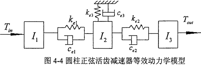根據(jù)上面敘述的方法,可以建立起如圖4-3所示的動(dòng)力學(xué)模型。為便于分析,將圓柱正弦活齒傳動(dòng)系統(tǒng)的動(dòng)力學(xué)模型簡化,由于在一個(gè)工作周期中,各活齒在扭振方向的工作狀態(tài)完全相同,故可將所有的活齒等效為一個(gè)慣性元件,并根據(jù)熱能不變的原則,將各活齒副的嚙合剛度轉(zhuǎn)化為等效的扭轉(zhuǎn)剛度,然后疊加得出整體的等效扭轉(zhuǎn)剛度。由此,各活齒與主動(dòng)軸、導(dǎo)架及殼體間并聯(lián)的彈性連接和阻尼分別等效為一個(gè)彈性軸段。等效簡化后的動(dòng)力學(xué)模型如圖4-4所示。