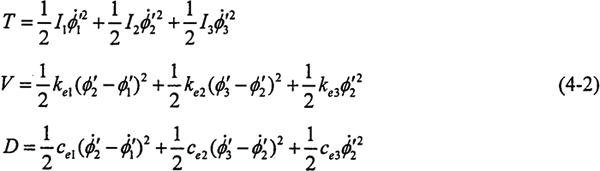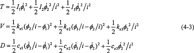 對(duì)轉(zhuǎn)換成鏈狀結(jié)構(gòu)的系統(tǒng),應(yīng)用拉格朗日法建立系統(tǒng)的扭振動(dòng)力學(xué)方程,系統(tǒng)中帶有粘性阻尼,因此列出含有耗散函數(shù)的拉格朗日方程
