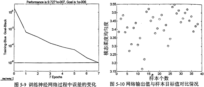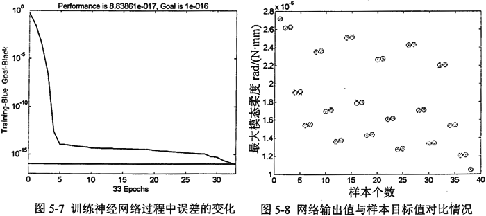 進(jìn)行動(dòng)態(tài)優(yōu)化時(shí),若要建立起目標(biāo)函數(shù),首先要獲得一組能夠精確計(jì)算f4(x)的權(quán)值,這就需要通過樣本訓(xùn)練BP神經(jīng)網(wǎng)絡(luò),當(dāng)誤差精度達(dá)到要求時(shí),訓(xùn)練停止,并得到了該組權(quán)值,利用該組權(quán)值與設(shè)計(jì)變量通過三層BP網(wǎng)絡(luò)可以計(jì)算出訓(xùn)練后的分目標(biāo)函數(shù)值f4(x)。在訓(xùn)練神經(jīng)網(wǎng)絡(luò)時(shí),學(xué)習(xí)速率取為0.01,動(dòng)量常數(shù)取為0.9,目標(biāo)誤差取為l×10-16。當(dāng)訓(xùn)練結(jié)束時(shí),網(wǎng)絡(luò)輸出值與樣本目標(biāo)值之間的誤差均方根值為8.8386×l0-17(見圖5-7),訓(xùn)練過程誤差的變化情況及訓(xùn)練完成后網(wǎng)絡(luò)輸出值與樣本目標(biāo)值對(duì)比情況如圖5-8所示。