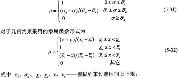 5.4.3.2隸屬函數(shù)及容差的確定 模糊約束的隸屬函數(shù),應(yīng)根據(jù)約束的性質(zhì)來具體確定,為簡(jiǎn)便計(jì)算,本文均采用線性嫦娥屬函數(shù),對(duì)于性能約束采用的隸屬函數(shù)形式為