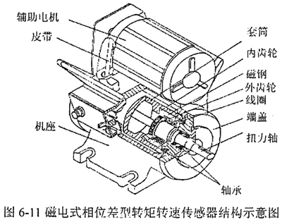 圖6-11為磁電式相位差型轉(zhuǎn)矩轉(zhuǎn)速傳感器的結(jié)構(gòu)示意圖,它由機(jī)座、端蓋、扭力軸、內(nèi)齒輪、外齒輪、磁鋼、線圈軸承等組成。內(nèi)齒輪、磁鋼固定在套筒上,線圈固定在端蓋上,外齒輪固定在扭力軸上,當(dāng)內(nèi)外齒輪發(fā)生相對轉(zhuǎn)動時,由于磁通不斷變化,在線圈中便感應(yīng)出近似正弦波的感應(yīng)電勢ul、u2,兩感應(yīng)電勢的初始相位差是恒定的,考慮到正反加載,φ0設(shè)計(jì)在大約180°位置上,當(dāng)加上扭力時,扭力軸發(fā)生扭轉(zhuǎn)變形,在彈性范圍內(nèi)外加扭矩與機(jī)械扭轉(zhuǎn)角成正比,這時ul、u2訊號的相位差要發(fā)生變化,即