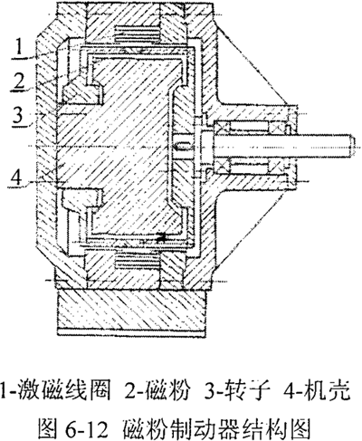 采用磁粉制動器作為試驗(yàn)的加載裝置。磁粉制動器由轉(zhuǎn)子、機(jī)殼、激磁線圈、磁粉組成,其結(jié)構(gòu)如圖6-12所示。在激磁線圈不通電流時,不產(chǎn)生磁通,磁粉呈自由狀態(tài)。當(dāng)軸轉(zhuǎn)動時,由于離心力的作用,使磁粉散布在轉(zhuǎn)動件與機(jī)殼之間,若此時激磁線圈通電流,則在線圈周圍產(chǎn)生磁場,轉(zhuǎn)動件與機(jī)殼間的磁粉沿磁通方向連接成鏈狀,由于磁粉間的結(jié)合力,使工作面之間產(chǎn)生摩擦力,從而形成制動力矩,起到加載的作用。該力矩與激磁電流的大小基本成正比,故通過調(diào)節(jié)激磁線圈的電流大小可在一定范圍內(nèi)改變制動力矩的大小。