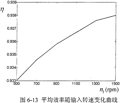 同樣方式測得當(dāng)輸入轉(zhuǎn)速分別為700rpm、900 rpm、1100 rpm、1300 rpm、1500 rpm時,減速呂樣機(jī)的平均效率隨輸入轉(zhuǎn)速變化曲線如圖6-13。通過測試結(jié)果表明,在低中速情況下,減速器的傳動效率受其轉(zhuǎn)速的影響不明顯,由于此時潤滑脂溫度較低,隨著轉(zhuǎn)速的增加,減速器的傳動效率略有提高,其平均值在93%以上,由引說明本文設(shè)計(jì)的減速器具有較高的傳動效率。