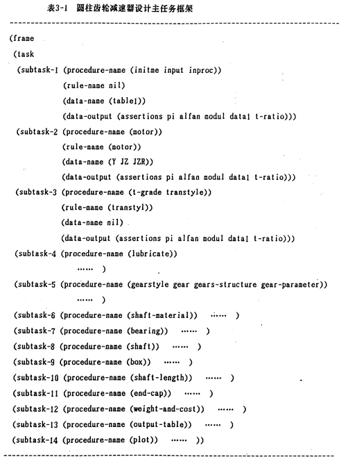 規(guī)格化的框架表達(dá)形式在圓柱齒輪減速器設(shè)計中應(yīng)用非常廣泛,如圓柱齒輪減速器中主任務(wù)框架(表3-1 ),齒輪強(qiáng)度校核中使用的各類系數(shù)框架(表3-2)等均具有知識的規(guī)格化框架表達(dá)形式。