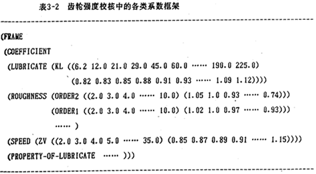 (2)圖表知識的數(shù)據(jù)化:圖表知識的數(shù)據(jù)化過程是首先將圖表進(jìn)行離散處理,然后,再對離散數(shù)據(jù)按數(shù)表型知識進(jìn)行處理。表3-2是齒輪強(qiáng)度校核中的各類圖表系數(shù)數(shù)據(jù)化后用框架形式表達(dá)的知識。其中,有潤滑劑(lubricator)系數(shù)KL,粗糙度(roughness)系數(shù)orderl (淬火齒面)、order2(調(diào)質(zhì)齒面),……。