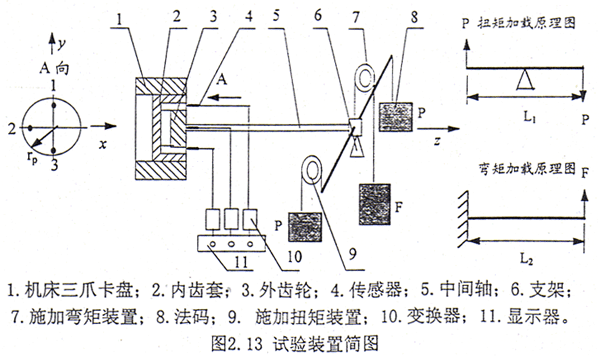 齒輪聯(lián)軸器的內(nèi)齒套固定在一個(gè)三爪卡盤上,聯(lián)軸器的外齒輪插入內(nèi)齒套與之相嚙合。采用3個(gè)電渦流傳感器,傳感器的布置見圖2.13,試驗(yàn)臺(tái)的實(shí)拍照片見圖2.14。中間軸的一端與外齒輪固接,而另一端則用于施加扭矩和施加繞X方向的彎矩。扭矩和彎矩的大小由法碼的重量和桿或軸的長(zhǎng)度來確定。作用于聯(lián)軸器上的扭矩
