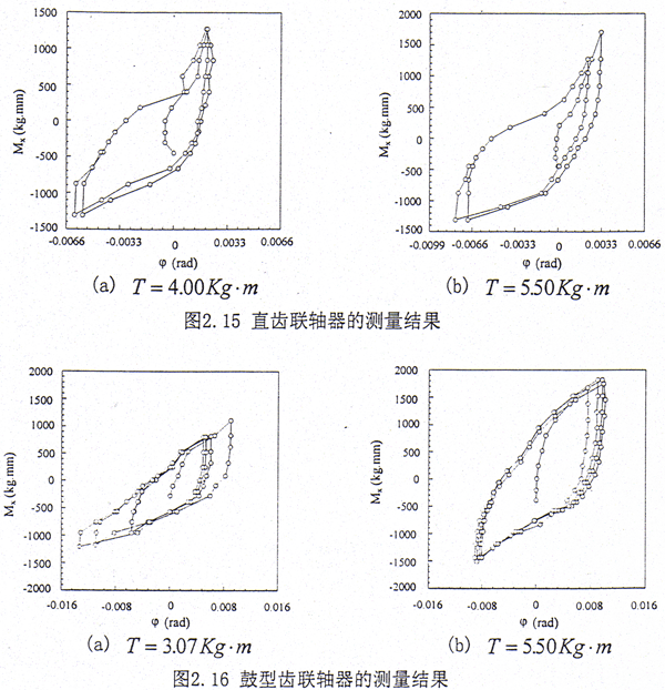 (5)對(duì)鼓形齒聯(lián)軸器在加載階段轉(zhuǎn)的平均轉(zhuǎn)角剛度ka進(jìn)行了計(jì)算,結(jié)果如下:在T=3.07kg·m時(shí),ka≈9.2×104kg·mm;在T=5.50gk·m時(shí),ka≈1.1×105kg·mm。對(duì)于直齒聯(lián)軸器Mx-φ的關(guān)系呈現(xiàn)出非線性,轉(zhuǎn)角剛度ka即為曲線的斜率,從圖2.15可知轉(zhuǎn)角剛度ka是變化的。在轉(zhuǎn)角取大值時(shí),ka值較大;在轉(zhuǎn)角取小值時(shí),ka值比較小。為了便于比較,在此對(duì)文獻(xiàn)[31]中(其中參數(shù)為:鼓形齒輪聯(lián)軸器模數(shù)為2.5,齒數(shù)為35,T=15.0kg·m,鼓形量為113~140微米)的測(cè)試結(jié)果也進(jìn)行了計(jì)算,結(jié)果為ka≈9.1×105kg·mm,造成二者結(jié)果的差距主要是外載荷和由于齒輪結(jié)構(gòu)參數(shù)的不同而引起齒對(duì)剛度具有相當(dāng)大的差別,但從總體來說這一轉(zhuǎn)轉(zhuǎn)角剛度的數(shù)量級(jí)不大。因此在實(shí)際系統(tǒng)的動(dòng)力學(xué)分析中,齒輪聯(lián)軸器的轉(zhuǎn)角剛度應(yīng)取一小量。