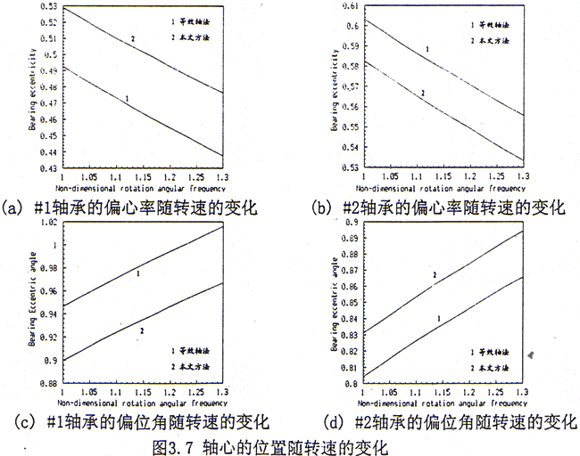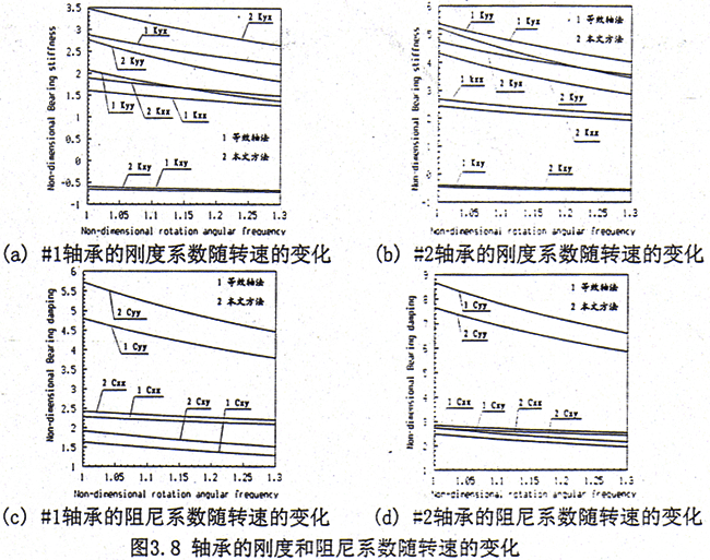 對于對稱軸承—轉(zhuǎn)子—齒輪聯(lián)軸器系統(tǒng),計算步驟如下:1)軸心的平衡位置隨轉(zhuǎn)速的變化關(guān)系,結(jié)果如圖3.7所示。2)軸承的油膜剛度和阻尼系數(shù)隨轉(zhuǎn)速的變化關(guān)系,結(jié)果如圖3.8所示。由于在兩側(cè)轉(zhuǎn)子上對應(yīng)軸承的特性相同,故僅列出在左側(cè)轉(zhuǎn)子上二個軸承(#1和#2)處的結(jié)果。