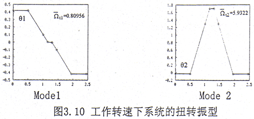 在ka=0.128不計內(nèi)阻尼時,工作轉(zhuǎn)速下系統(tǒng)的前12階彎曲振動復(fù)模態(tài)圖見圖3.9。從復(fù)模態(tài)圖上可以看出,在低階彎曲模態(tài)中,輪齒的變形是較小的,輪齒變形較大主要發(fā)生在高階模態(tài)中。這與實際情況比較接近,因為在實際的轉(zhuǎn)子系統(tǒng)中,輪齒的剛度一般比軸段的剛度要大許多,因此在低階的彎曲模態(tài)中,輪齒的變形體現(xiàn)不出來。系統(tǒng)前2階的扭轉(zhuǎn)振型如圖3.10所示。在前二階扭轉(zhuǎn)振型中輪齒變形也較小。