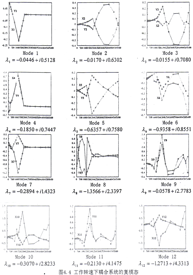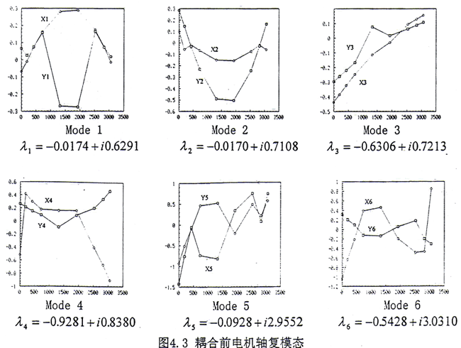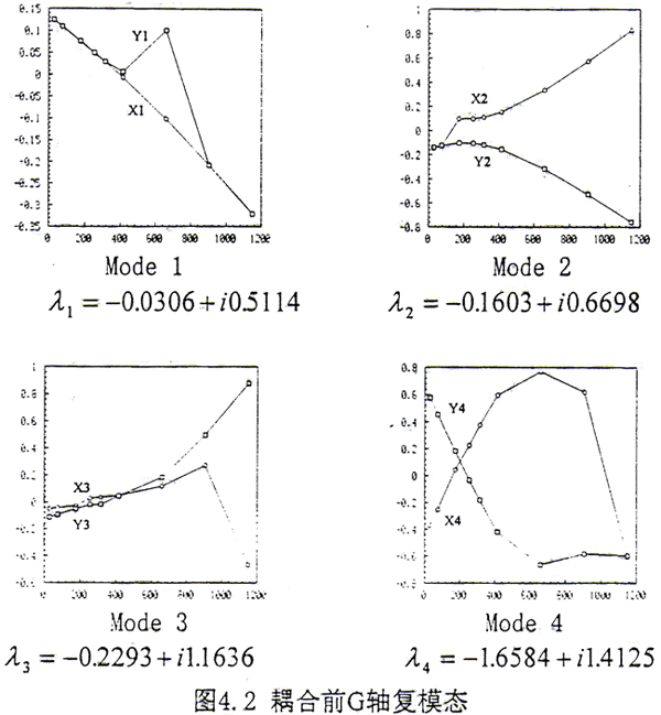 通過(guò)齒輪聯(lián)軸器耦合后的轉(zhuǎn)子系統(tǒng),在上述給定的轉(zhuǎn)速范圍內(nèi),共為12階模態(tài),如圖4.4所示,比耦合前多了2階。這表明耦合后在上述轉(zhuǎn)速范圍內(nèi)模態(tài)數(shù)目發(fā)生了變化。耦合系統(tǒng)的模態(tài)可以分為兩類(lèi):(1)第一類(lèi)為耦合成分很小的振動(dòng),例如Mode1、Mode4、Mode7、Mode8,這4階幾乎完全表現(xiàn)為G軸的振動(dòng),電機(jī)軸的振動(dòng)很小。但是從模態(tài)圖上來(lái)看又不能與耦合前單個(gè)G軸的4階模態(tài)相對(duì)應(yīng),主要表現(xiàn)為與齒輪聯(lián)軸器相連接的G軸的外伸端在耦合前上述4階的振動(dòng)很大,而在耦合后振動(dòng)受到很大的抑制,振動(dòng)很小。從復(fù)特征值來(lái)看,無(wú)論是反應(yīng)系統(tǒng)衰減快慢的實(shí)部,還是反映系統(tǒng)自然振動(dòng)頻率的虛部都有不小的變化。如果將上述4階對(duì)應(yīng)的復(fù)特征值作一比較,那么其中耦合后的虛部值總是大于耦合前的對(duì)應(yīng)值。其主要原因是在耦合后將G軸和電機(jī)軸作為一個(gè)整體系統(tǒng)來(lái)考慮,此時(shí)相當(dāng)于將電機(jī)軸看作是對(duì)G的一個(gè)約束,這一約束直接作用于外伸端,使得G軸外伸端的振動(dòng)減小,同時(shí)使得G軸的自然頻率增大。因此傳統(tǒng)上在計(jì)算DH機(jī)組的動(dòng)態(tài)特性時(shí),強(qiáng)行將G軸和電機(jī)軸分開(kāi),而只考慮其中的G軸,僅從這4階模態(tài)和復(fù)特征值上進(jìn)行分析也會(huì)產(chǎn)生較大的偏差。(2)第二類(lèi)為G軸和電機(jī)軸之間的耦合模態(tài),在這8階模態(tài)中G軸和電機(jī)軸的振動(dòng)非常明顯,這表明如果將G軸和電機(jī)軸在齒輪聯(lián)軸器處分開(kāi)處理,僅計(jì)算G軸的振動(dòng),而不考慮電機(jī)軸的影響,那么上述8階模態(tài)會(huì)全部被漏掉,因此這樣處理會(huì)丟失一些非常重要的低頻信息。在文獻(xiàn)[18]中,由于未考慮電機(jī)軸的作用,因此與電機(jī)軸有關(guān)的模態(tài)信息就不出現(xiàn)。如果從這8階復(fù)特征值前6階的數(shù)值來(lái)看,那么都能從耦合前電機(jī)軸的6階模態(tài)中找到,而且低階特征值的實(shí)部和虛部變化均不大。這說(shuō)明如果僅分析電機(jī)軸的振動(dòng),那么將G軸忽略掉,倒能得到較好的近似。從直觀上看,將G軸與電機(jī)軸相比,其質(zhì)量和幾何參數(shù)要小許多。如果將G軸看成是電機(jī)軸的約束,那么這一約束比電機(jī)軸對(duì)G軸的約束自然要弱得多。因此從這一意義上來(lái)說(shuō)G軸對(duì)電機(jī)軸的影響沒(méi)有電機(jī)軸對(duì)G軸的影響大。綜上所述,耦合后電機(jī)軸對(duì)G軸的影響較大,而G軸對(duì)電機(jī)軸的影響較小。在實(shí)際工程中,象DH這樣的機(jī)組曾發(fā)生電機(jī)振動(dòng)過(guò)大的現(xiàn)象[9],因此如果不將G軸、電機(jī)軸和齒輪聯(lián)軸器作為整體一起進(jìn)行分析而在齒輪聯(lián)軸器處強(qiáng)行分開(kāi)只分析G軸的振動(dòng)就顯得極不合適。