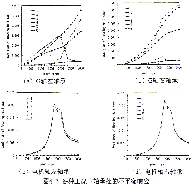 比較圖4.5a和4.6a可見,同樣在G軸的大齒輪上存在不平衡量,單軸和耦合系統(tǒng)所產生的響應卻有較大的差別。用單個G軸計算,從G軸的左端開始到右軸承不平衡響應幅值變化比較平緩,隨后迅速增大,在外伸端達到最大值;而用耦合系統(tǒng)來計算,則在G軸的左端振幅最大,比用單個G軸計算所得值在同一位置高得多,隨后迅速減小,在G軸的右軸承處振幅最小,之后又迅速增大,在外伸端達到一極值,但比用單個G軸所得值小,這一特點表明,耦合后G軸外伸端的不平衡響應受到一定程度的抑制;從圖4.6b可知,聯(lián)軸器的不平衡量對本身的振動產生較大的影響,對G軸左右軸承的影響較小,當然這與聯(lián)軸器的不平衡量密切相關,如果聯(lián)軸器的不平衡量較大,則另當別論;由圖4.6f可見,在G軸、聯(lián)軸器和電機軸上同時存在不平衡量時,在工作轉速下,聯(lián)軸器處的響應幅值很大,與圖4.6b相比可知,聯(lián)軸器處的振動是G軸、聯(lián)軸器本身和電機軸三處不平衡力綜合作用的反應,聯(lián)軸器處振動過大對其可靠運行帶來不利。另外比較圖4.5和圖4.6可知,電機軸的不平衡響應主要是由電機軸自身的不平衡造成的,G軸和聯(lián)軸器的不平衡對其影響很小。從圖4.7可見,僅在G軸上作用不平衡力,當轉速超過1000(rpm)后,用耦合系統(tǒng)計算所得G軸軸承上的振幅明顯大于用單個G軸所得值,而且隨轉速增大,變化越明顯。在工作轉速下,二軸承處的振幅前者分別是后者的1.60倍和1.66倍,這表明用單個G軸計算G軸二側軸承的不平衡響應是不安全的,而且實際測量[18]的結果確實要比計算所得的值要大得多。另外,在軸承處的不平衡響應,只要是用耦合系統(tǒng)進行計算,那么在非共振區(qū)各轉子的不平衡只對本身所所在二個軸承的振幅起決定作用,而對另二個軸承影響不大。這反映了在一般情況下,一側轉子的不平衡所引起的振動通過聯(lián)軸器而傳遞到另一側的振動較小,這也正是齒輪聯(lián)軸器被廣泛采用的另一個優(yōu)點。