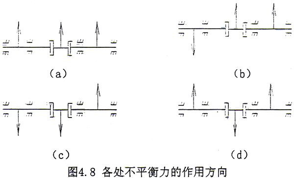 在實際系統(tǒng)中,不平衡力的作用方向是無法預知的,不妨設系統(tǒng)不平衡力的作用方向分別如圖4.8a~4.8d所示。各處不平衡量同上。計算了在3處同時具有不平衡力,耦合系統(tǒng)的不平衡響應。結果見圖4.9a~4.9d。從中可以看出,不平衡力作用方向的不同對G軸兩側的支承軸承有一定的影響,但影響不大,對電機軸兩側的支承軸承則幾乎沒有任何影響。