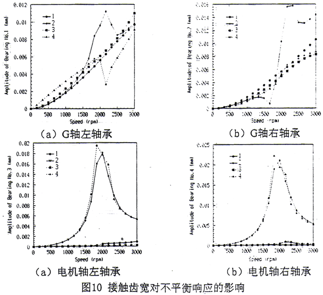 圖4.10a~4.10d表示了接觸齒寬對不平衡響應的影響。圖中符號:1—耦合系統(tǒng)在3處同時作用不平衡力(全齒寬接觸),2—耦合系統(tǒng)在G軸上作用不平衡力(全齒寬接觸),3—耦合系統(tǒng)在3處同時作用不平衡力(接觸齒寬為小量),4—耦合系統(tǒng)在G軸上作用不平衡力(接觸齒寬為小量)。從圖中可見,在非共振區(qū)接觸齒寬b對G軸上靠近聯(lián)軸器的右軸承影響較大,對其它軸承的振動影響要小得多。這實際上反應了電機軸對G軸耦合程度的增加。