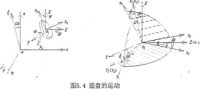圓盤的運(yùn)動可分解成隨其質(zhì)心的平動和繞質(zhì)心的轉(zhuǎn)動。質(zhì)心o1的平動位移為(xc,yc),不計(jì)沿z軸方向的運(yùn)動。圓盤繞質(zhì)心的轉(zhuǎn)動可用三個(gè)歐拉角來表示,如圖5.4所示。設(shè)o1XYZ是與oxyz平行的坐標(biāo)系。o1XYZ坐標(biāo)系的單位矢量為