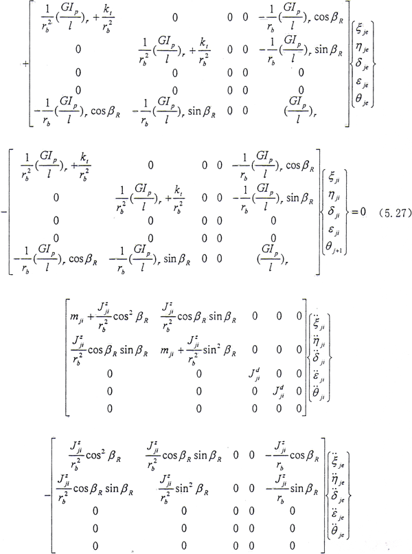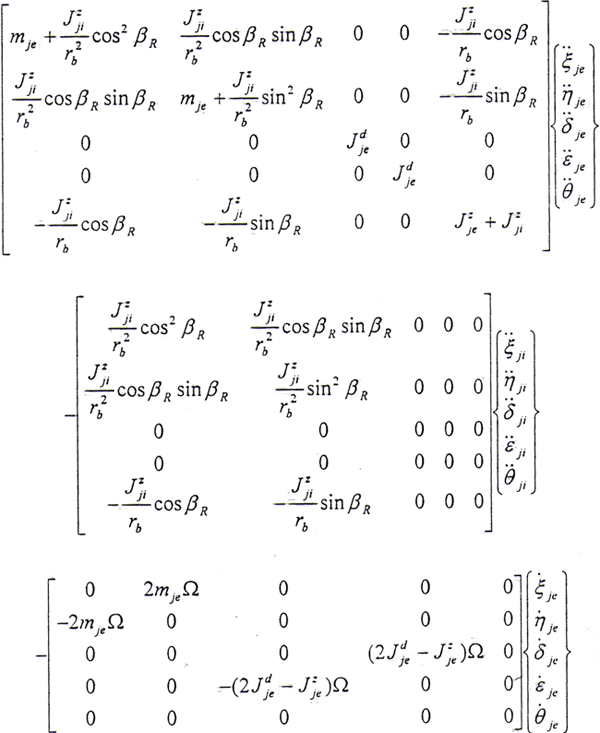 半齒輪聯(lián)軸器系統(tǒng)的動能包括內(nèi)外齒輪的平動動能和轉(zhuǎn)動動能;彈性勢能包括左右軸段的彈性勢能和半齒輪聯(lián)軸器的彈性勢能;耗散函數(shù)包括內(nèi)外齒輪之間的橫向內(nèi)阻尼和轉(zhuǎn)角內(nèi)阻尼,由于扭轉(zhuǎn)內(nèi)阻尼較小可將其忽略,具體的分析過程可參見第三章3.2.2和3.2.3節(jié)。這樣取q=ξje,ηje,δje,εje,θje,ξji,ηji,δji,εji為廣義坐標(biāo),將以上的約束方程(5.26)式代入半齒輪聯(lián)軸器系統(tǒng)的動能,勢能及耗散函數(shù)中,消去多余的變量θji,再由拉格朗日方程就可以得到在齒輪嚙合處的運(yùn)動微分方程。由于推導(dǎo)過程比較冗長,在此僅列出最終的運(yùn)動微分方程。對于小偏離情況,將其中的高階小量略去,則對于第j個(gè)結(jié)點(diǎn)(其中外齒輪下標(biāo)為e,內(nèi)齒套下標(biāo)為i)