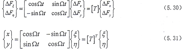 通過上述過程,得到了半聯(lián)軸器系統(tǒng)的運(yùn)動微分方程,再與其他各結(jié)點(diǎn)的運(yùn)動方程集合在一起,就得到轉(zhuǎn)子—齒輪聯(lián)軸器系統(tǒng)的運(yùn)動方程。然而,對于旋轉(zhuǎn)機(jī)械,在轉(zhuǎn)子的某處總存在著軸承,即形成軸承—轉(zhuǎn)子—齒輪聯(lián)軸器系統(tǒng),這樣就需要引入支承條件,具體的做法是只要在轉(zhuǎn)子—齒輪聯(lián)軸器系統(tǒng)上具有軸承支承的自由度處用廣義力(即軸承油膜力)來反映支承的影響。以滑動軸承為例,經(jīng)過線性化處理后的油膜力在固定坐標(biāo)系中可表示為