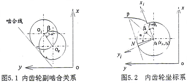 上式表明嚙合線與連心線是平行的,這一結(jié)論與文獻(xiàn)[100]相同,這從另一個(gè)側(cè)面驗(yàn)證了(5.10)式、(5.11)式的正確性。以上的嚙合關(guān)系與外齒輪嚙合具有類似的形式,只不過在齒輪聯(lián)軸器中,內(nèi)外齒輪的基圓半徑是相等的。由式(5.13)可以得