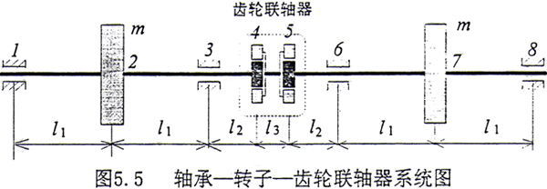 以上我們建立了半聯(lián)軸器系統(tǒng)的運(yùn)動(dòng)方程,而在實(shí)際系統(tǒng)中往往是由二對(duì)內(nèi)外齒輪同時(shí)嚙合傳動(dòng)(例如CL和CLZ型齒輪聯(lián)軸器),軸承—轉(zhuǎn)子—齒輪聯(lián)軸器系統(tǒng)如圖5.5所示。