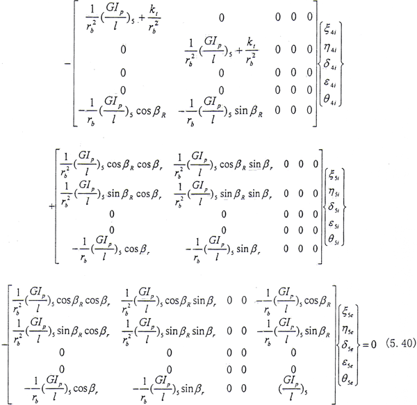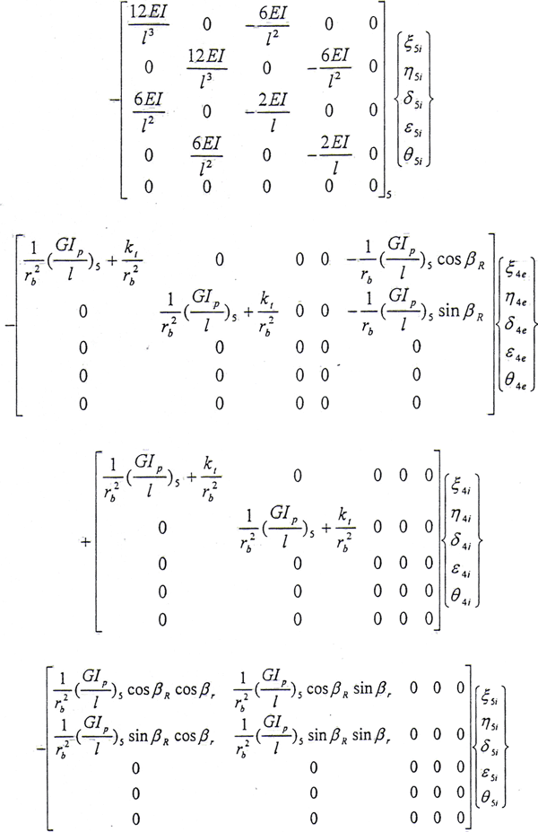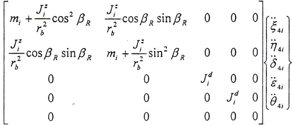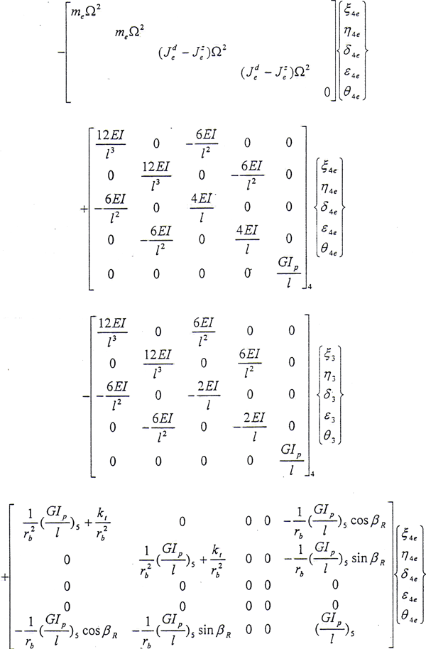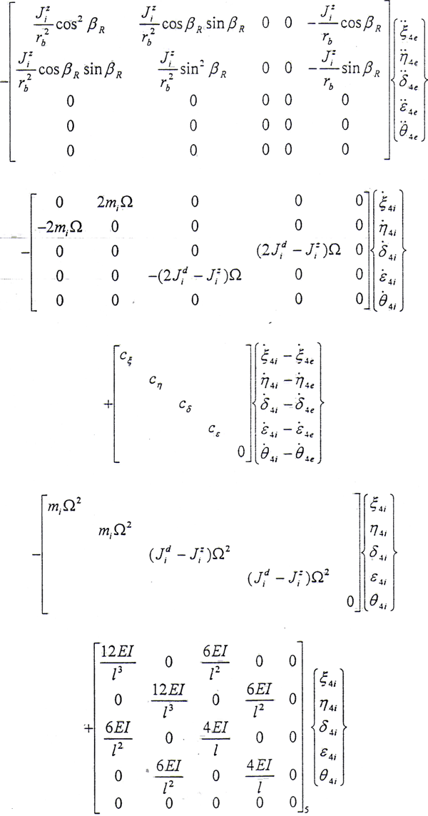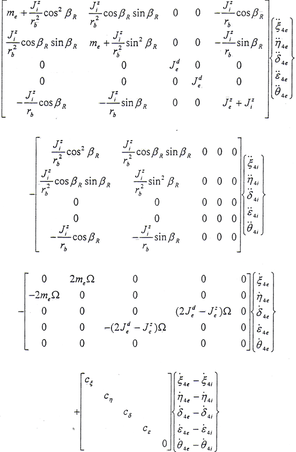 在式(5.27)和式(5.28)中,由于包含了θj+1(即為圖5.5中的θ5i)。而θ5i又必須要滿足以上的約束關(guān)系,所以可以想象在考慮了二個(gè)半聯(lián)軸器后,耦合關(guān)系更為復(fù)雜。但處理的方法是類同的,具體過程在此不再重復(fù)了。整個(gè)系統(tǒng)有8個(gè)結(jié)點(diǎn),共48個(gè)自由度。下面僅列出結(jié)點(diǎn)4處的運(yùn)動(dòng)微分方程。