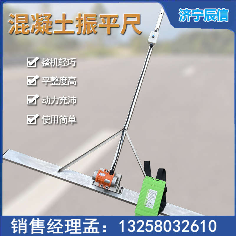 本機適合直接在混凝土上工作,利用鋁板的高強度和平整性,在高頻振動下實現混凝土的攤平及振實,同時完成提漿工序,達到一機多用的目的 電動振平尺產品參數: