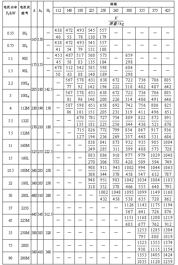 TZLD、TZSD型減速器的實際傳動比i、電機功率P1和選用系數(shù)K