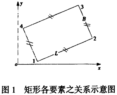 為限制整個(gè)圖形的整體位移旋轉(zhuǎn).選擇一基點(diǎn)及旋轉(zhuǎn)角限制3 個(gè)自由度,2 對(duì)邊的長(zhǎng)度(L 、B )限制2 個(gè)自由度,這時(shí)的矩形就是約束一致,即該矩形是唯一確定的,其各點(diǎn)坐標(biāo)由下列式子確定: